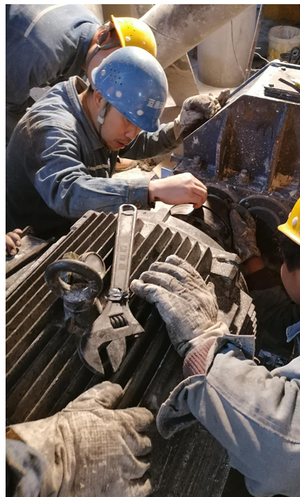 檢修人員調(diào)整減速機(jī)和電機(jī)的同心度