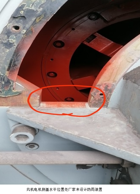 1月27日13時(shí),一號(hào)燒結(jié)機(jī)槽滿停機(jī),對應(yīng)的一期脫硫脫硝系統(tǒng)正常停機(jī)檢修。檢修班按照檢修計(jì)劃重點(diǎn)對增壓風(fēng)機(jī)電機(jī)開側(cè)蓋檢查,電儀人員首先對增壓風(fēng)機(jī)電機(jī)執(zhí)行停電、驗(yàn)電、接地、換牌、掛牌等安全措施。在檢查過程中發(fā)現(xiàn)電機(jī)側(cè)蓋水平位置處電機(jī)廠家未設(shè)計(jì)防進(jìn)水裝置,雖然電機(jī)制作了雨棚,但是如遇風(fēng)雨交加極端情況時(shí)電機(jī)側(cè)面可能存在飄雨,雨水有可能會(huì)進(jìn)入到電機(jī)內(nèi)部的風(fēng)險(xiǎn)。