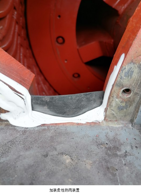 為了消除這一重大險(xiǎn)兆安全隱患,電儀人員隨即采取了技改措施,在電機(jī)側(cè)蓋水平位置處粘接一塊柔性檔雨板。為了確保萬無一失,所有固定螺絲絲牙和端蓋接觸面涂抹密封膠。從技術(shù)措施上防止了雨水進(jìn)入電機(jī)。
