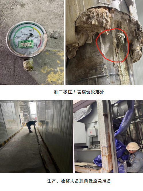34日9:23分蒸發(fā)濃縮硝二級強制循環(huán)蒸發(fā)器循環(huán)管道壓力表腐蝕脫落,硝二級高濃縮液存在泄漏風險,乙班白班班長林寧和電儀唐亮發(fā)現情況后立即匯報副部長楊平,楊平立即匯報生產部長黃安軍。若硝二級壓力表脫落,內部80方高濃縮液隨時會出現泄漏,導致重大環(huán)保事故和壓縮機電機有損壞風險。生產部隨即組織緊急停機、系統(tǒng)排空,消除潛在風險、隱患。